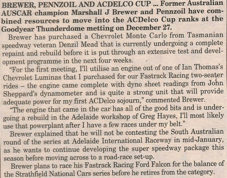 Marshall J. Brewer is one of the best-known drivers in AUSCAR history, he raced in the category for a decade and was the third person to win an AUSCAR title when he was crowned champion of the 1994/95 season.