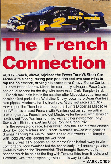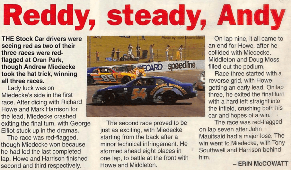 One of the race wins is claimed by Tony Southwell however Motorsport News and The Power Tour website both claim that it was Miedecke and Templer who won the three races that weekend.