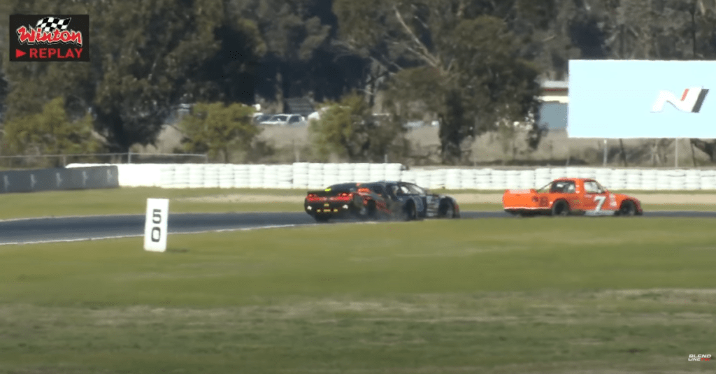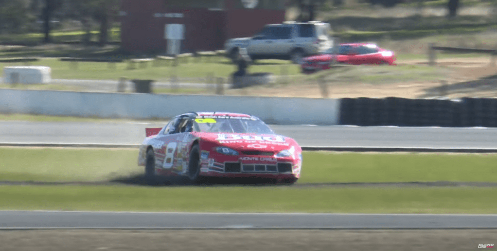 Richard White had a moment going into Turn 1, his #8 Monte Carlo spun in the front a pack, a nervous moment captured by the onboard camera.