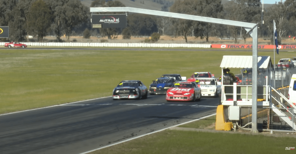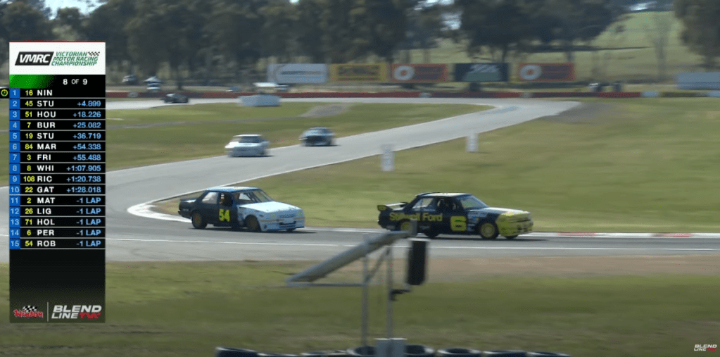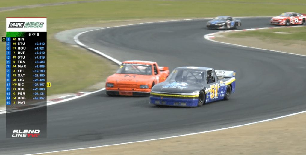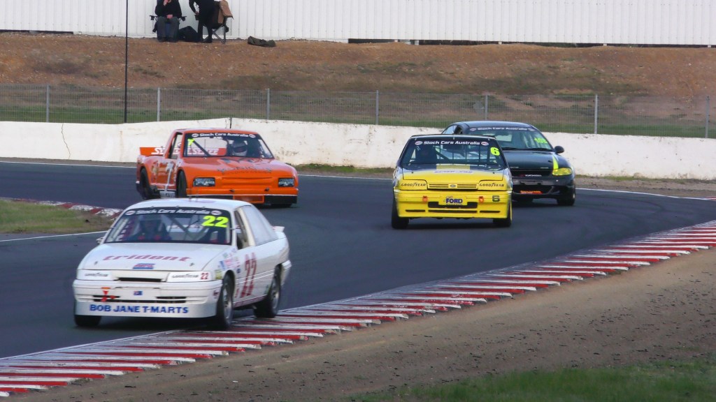 Lukas Gates in the lead SCA AUSCAR was running all by his lonesome in tenth position while Colin Matton and Brad Lighton were battling for eleventh position in the Commodores.
