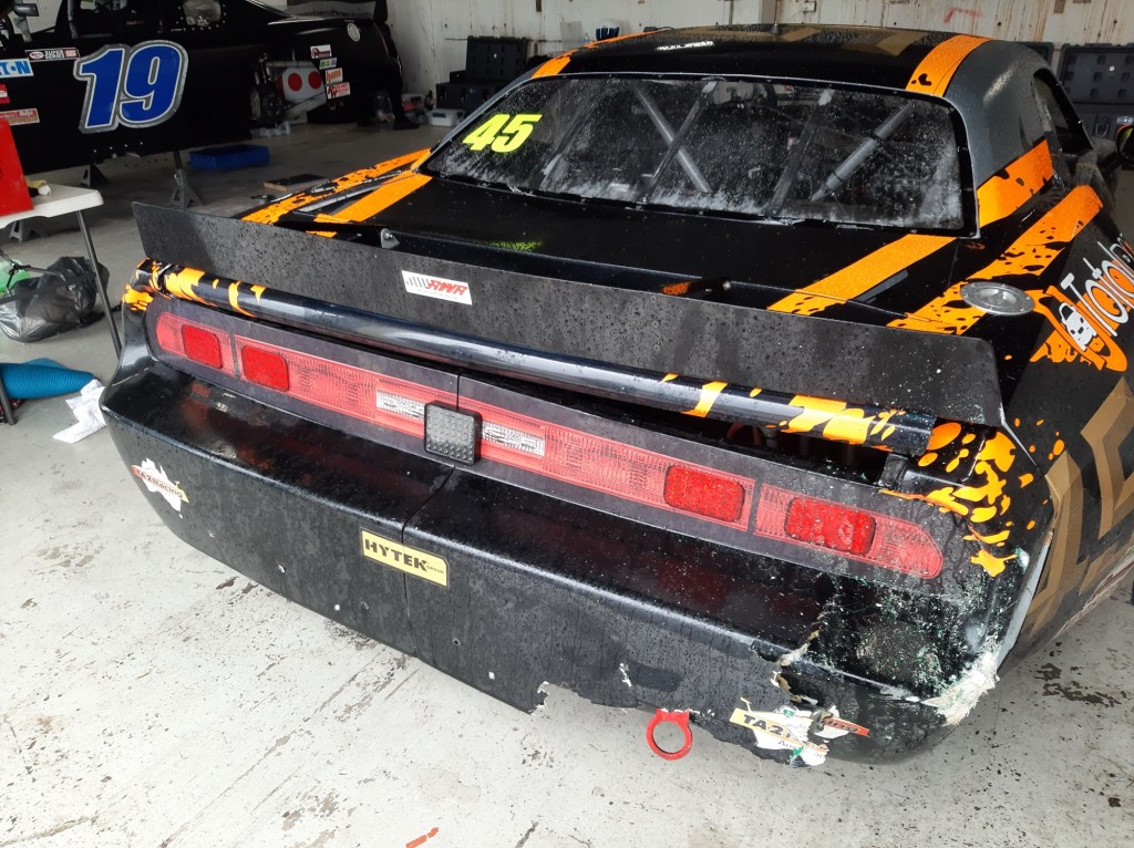 Jeff Stubbs hit the wall with the front and the back of his Dodge Challenger, he was able to drive the car back to the garage and plans were quickly made to repair the car, aiding in repairs was the fact that home base was only a short distance away.