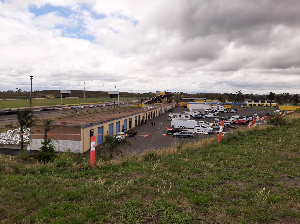 The weather changed as the cars were leaving the dummy grid and a rain shower soaked the track and those who were standing on the back of the Thunderdome’s backstretch mound, it is worth noting that from the top of the mound, you can see Melbourne in the distance.