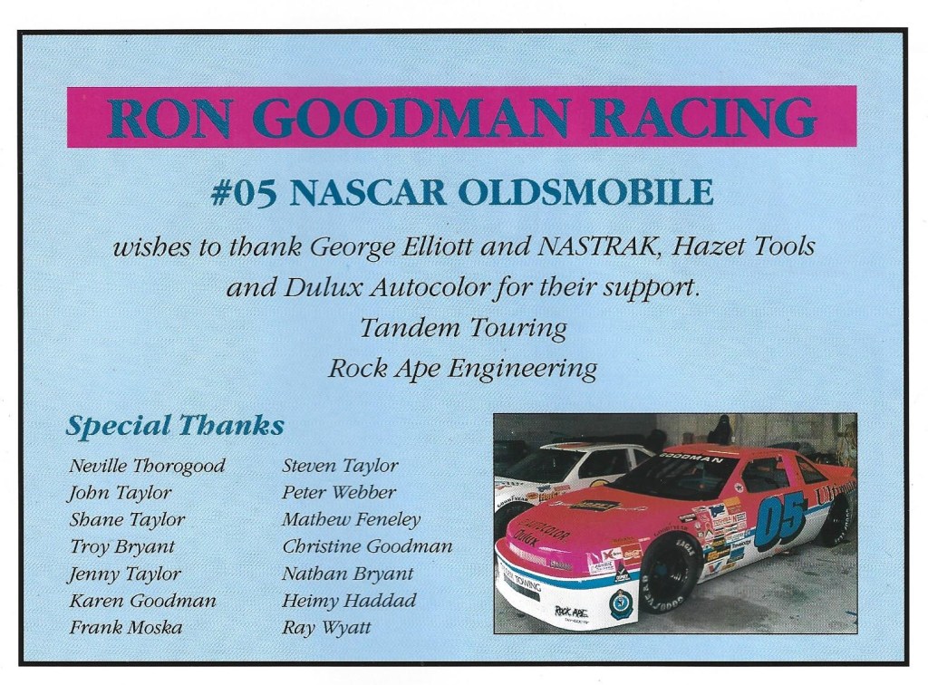 The #05 Ron Goodman Oldsmobile was an ex-George Elliot Oldsmobile as stated in the Round 4 1991/92 programme, it was originally claimed to be a car purchased from George, but a later publication said it was ‘lent’ (leased) to Ron by George, and it was given back to George.