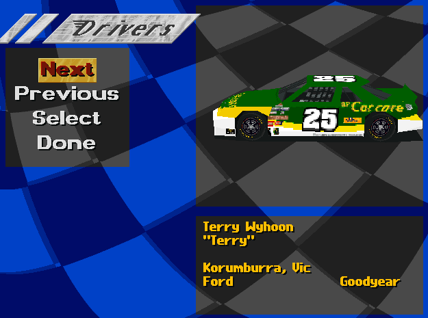 Two car sets of the Australian NASCAR field for NASCAR Racing (aka NASCAR Racing 1), Greg Hingerty made two car sets for the game, the sets are for the 1995/96 and 1996/97 seasons though the latter had some fillers as the field composition was uncertain.
