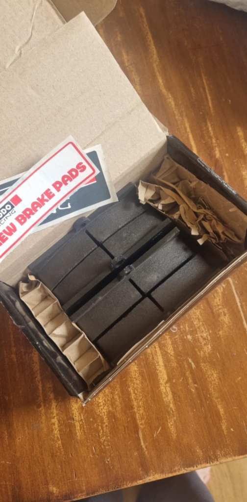 Brake pads were received on April 8, 2025, leaving just one more new piece and a replacement piece of the car to get before everything can be put together.
